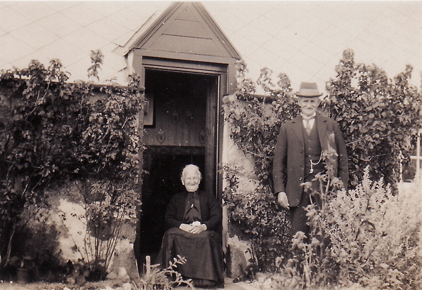 Who, where, when?Again, thought to be New Deer, they are certainly the same elderly couple who are shown standing near the garden gate with a young child and perhaps a mother and aunt in a previous photograph (see all photographs in "New Deer Investigation" and see this group for further details. Whoever they are, they look as if they have been together for many years, and they look happy and contented (and full of character). I think this is the same house again judging by the porch.